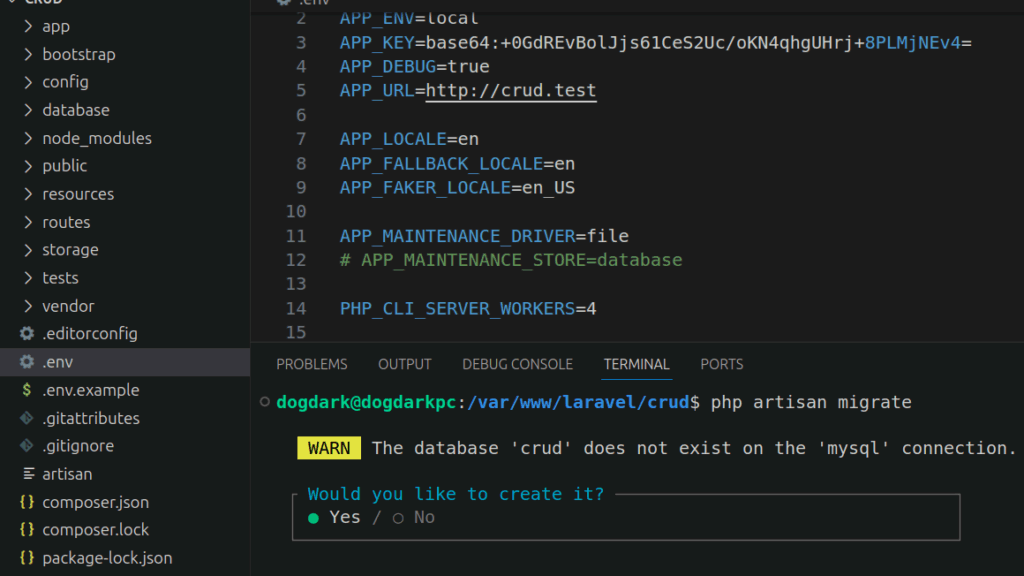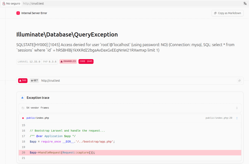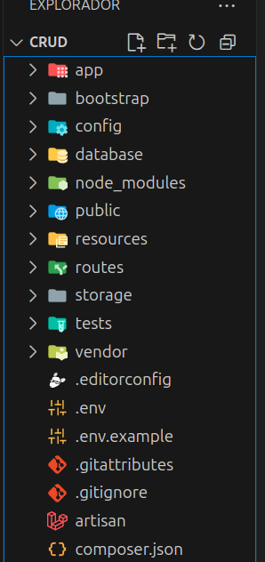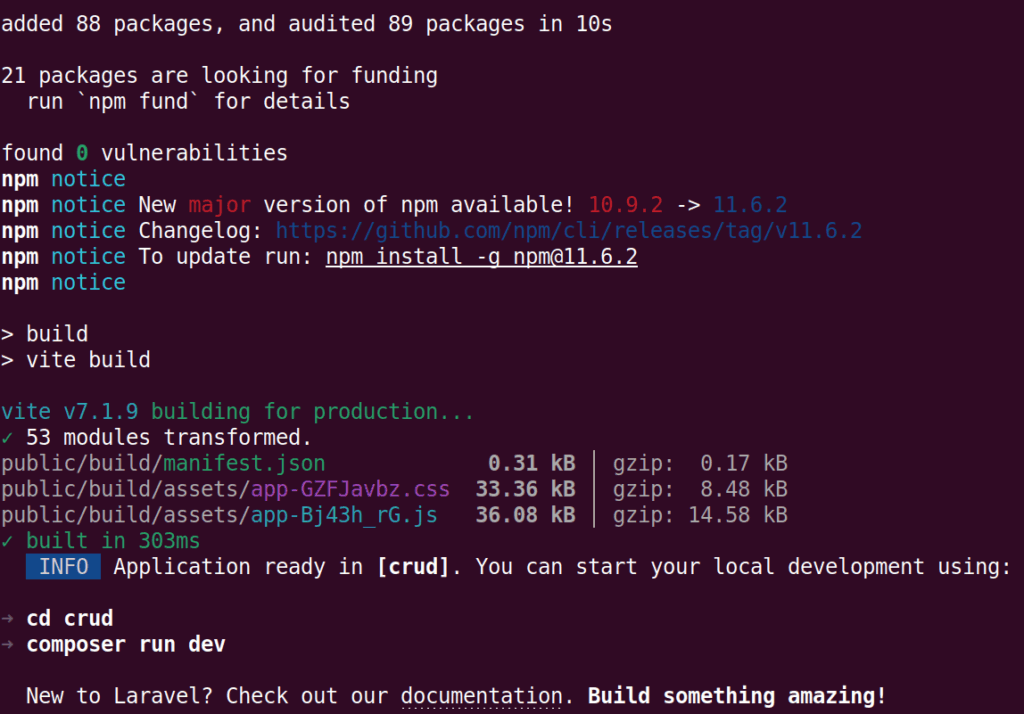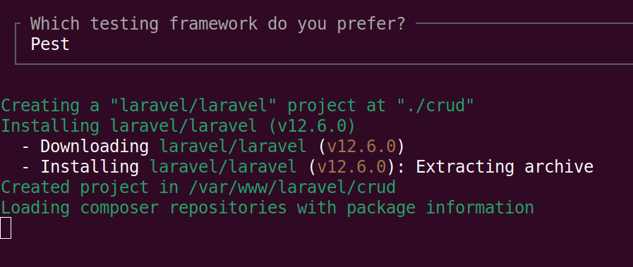 Se acabá de terminar de crear nuestro proyecto de laravel 12, llamado crud, y este se encuentra en la carpeta /var/www/laravel/crud.