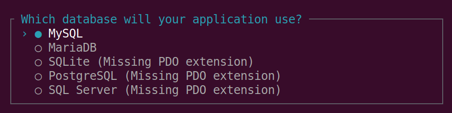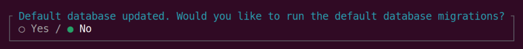 En esta parte nos pregunta si deseamos realizar una migración, por el momento solo coloca que no, porque se configurará a posterior, por defecto el archivo .env que trae laravel esta con un usuario root sin password y en la mayoría de servidores, en el caso de nosotros uno local, esta cuanta con una password.