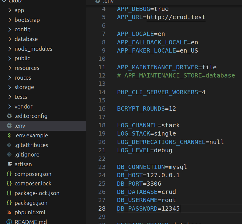 APP_URL=http://crud.test (En este campo agrega la url con la que trabajarás, en este caso crud.test)