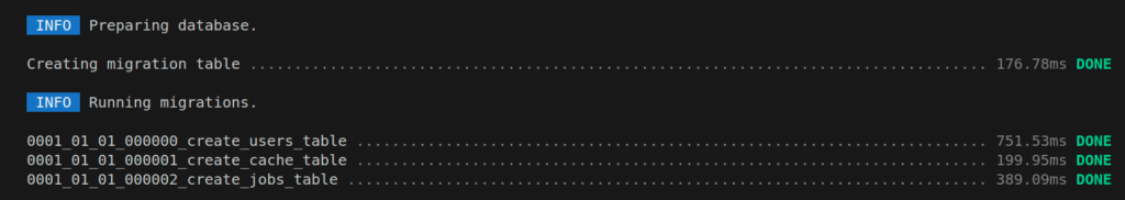 Ahora procedemos con la migración, en la terminal de visual studio code o en bash, dentro de la carpeta de nuestro proyecto, colocamos php artisan migrate y se crearán todas las tablas principales de nuestro proyecto en la base de datos.
